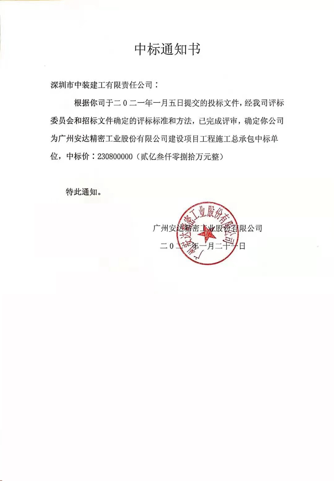 近日,中裝建工中標廣州安達精密工業股份有限公司建設項目工程施工承包(以下簡稱“廣州安達股份施工總承包項目”),中標金額為2.3億元。
